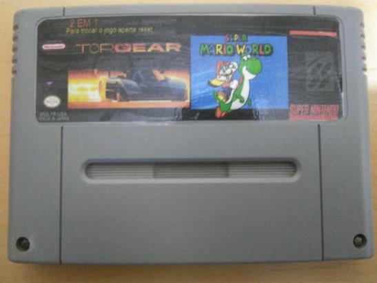 Cartucho com 2 jogos Top Gear + Super Mario World para Super Nintendo reprogramado em Português BR em placa do jogo original Nintendo testado, funcionando e salvando. Placa do jogo e contatos revisados de forma correta e com produto adequado